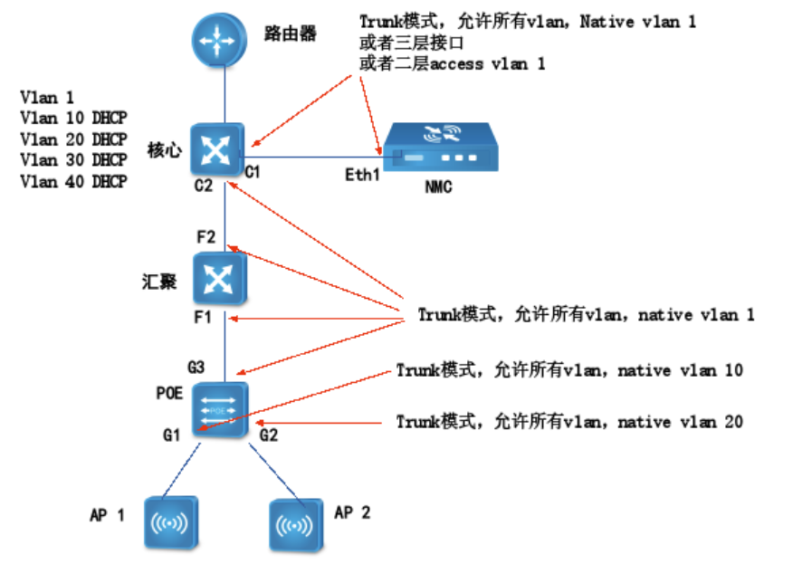 与核心交换机互联的F2口、与接入层交换机互联的F1口都配置成trunk口,允许AP的vlan10 vlan20和用户的vlan30 vlan40通过,native vlan1(默认就是vlan1,也可以不设置native vlan)。